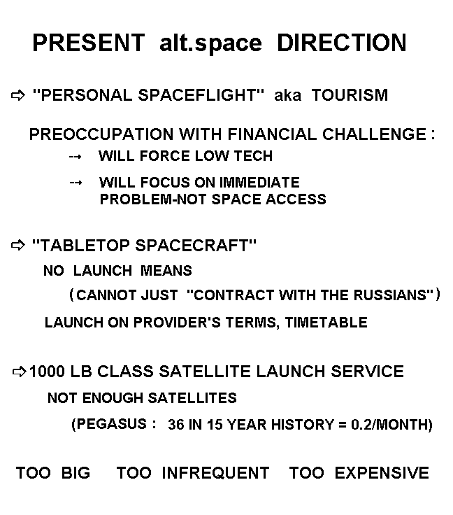 Space tourism is getting the most press because of the recent X-Prize and plans to build a huge new industry. It's not going to be that simple. If any of these do actually start flying paying passengers, the business and financial risks are so great that the effort will be focused on making it succeed and not developing access to space--to at least delivering people to a LEO satellite.
