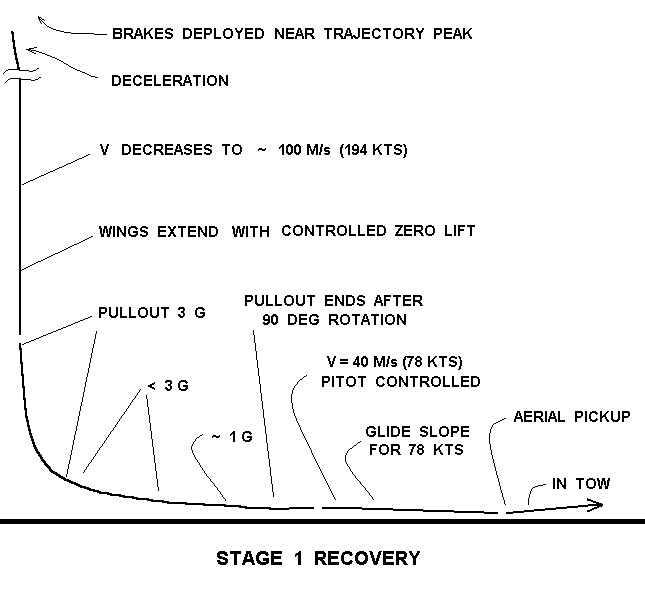 A pitot tube on the nose is to then maintain a steady glide speed of, say 40 m/sec (78 knots) by controlling the pitch. The stage is then to glide in this way until it is picked up and taken in tow by a small aircraft. The towing force will be less than 50 pounds.