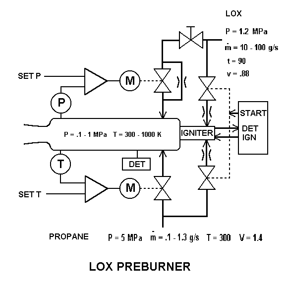 The preburner is to be able to operate by itself, using servos to control the temperature and pressure of the oxygen. The oxygen is to pass through a nozzle in order to isolate the preburner from the combustion chamber downstream. An oxygen to fuel ratio of 100 to 1 will produce a gas temperature of about 60 C.