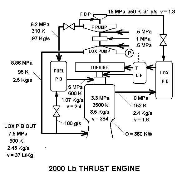 The preburner developed for the upper stage engines would be scaled up in size and pressure to drive a turbine with oxygen gas at a moderate temperature, say, 500 to 600 K (230 to 330 C) so the materials for the turbine and associated parts can be of copper, bronze, or monel. The Russian RD-170 uses an oxygen temperature of 772 K in order to get the power to support a very high chamber pressure. For a lower pressure of, say, 3.3 MPa (500 psi), calculations show that the lower temperature is sufficient.