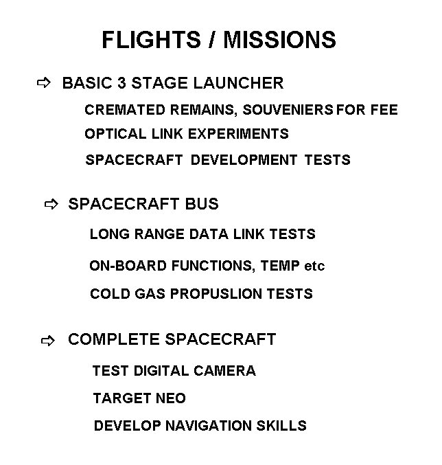 By perfecting a first generation of very small launcher/spacecraft combination, and using a high launch rate the cost basis for all scaled up versions to follow would be minimized. Also, the skills to launch and manage spacecraft would develop.