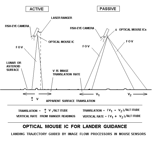 The guidance might use a small diode laser as a LIDAR, and one mouse chip to control the transverse movement while the LIDAR controls the descent. Or it could be wholly passive, using 3 or 4 mouse chips which together measure the movement in 3 axes.