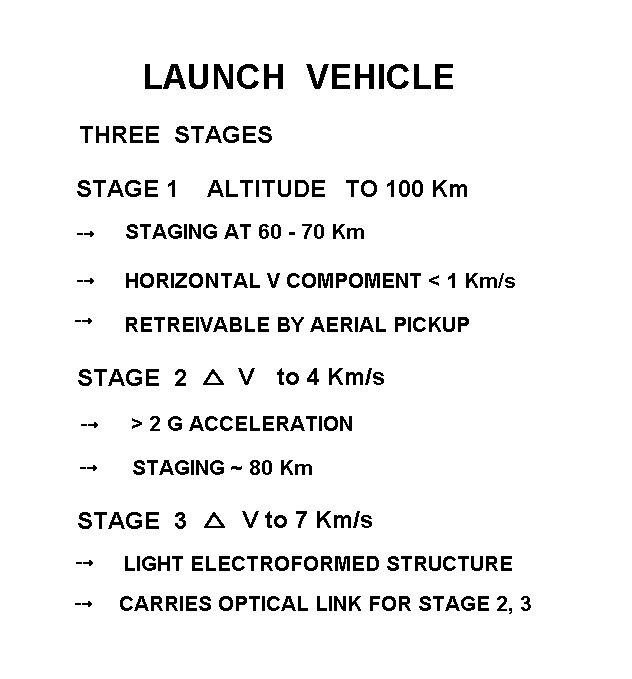 The major component of the system is the launch vehicle. This is to use 3 stages, each using a type of staged combustion engine derived from a single "prototype engine". A customer or funding might support development of a staged combustion turbopump engine, to be used for the first stage.