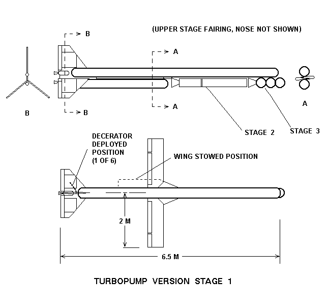 The propellant tanks are the main structure, with the engines and fins at the lower end, a "wing box" at an adjustable point near the center of gravity, and the upper stages within an enclosure at the upper end. The wings are to extend in a manner similar to those of a cruise missile, after the stage has decelerated to a low subsonic velocity.