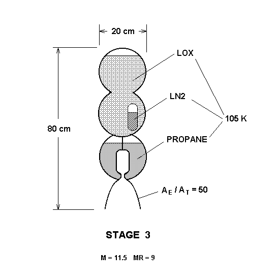 The third stage is to make use of very thin electroformed nickel structure and use a low tank and engine pressure to allow a very low empty weight. The tank pressure is to be about 0.38 MPa (57 psia), the vapor pressure of liquid oxygen at 105 deg K; and an engine pressure of about 0.15 MPa (1.5 atm). The low pressures are to allow low mass and radiation cooling of part of the engine.