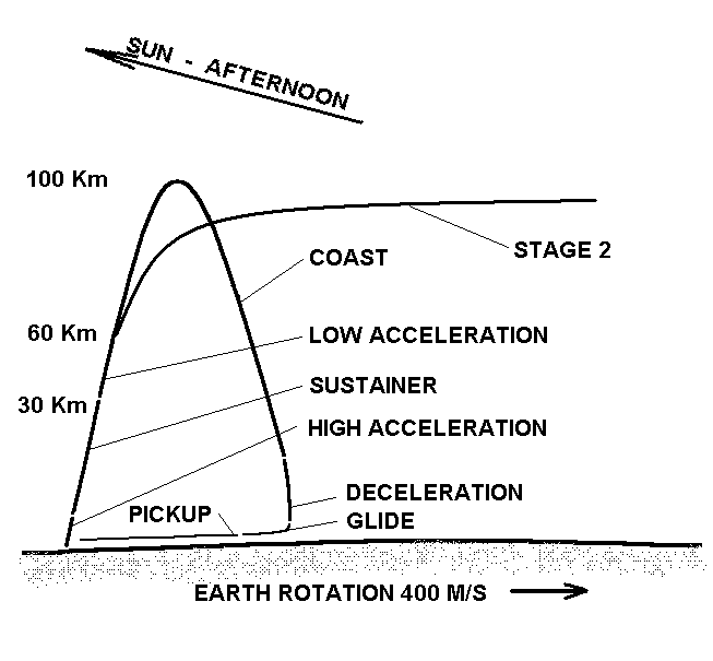 The first stage is to deliver the upper two to an altitude having near vacuum conditions--about 60 to 70 Km (200,000 to 233,000 feet), while having the vertical momentum to continue to about 100 Km. This "lofted" trajectory permits a more horizontal attitude for the second stage, in a way similar to Shuttle launches. The initially planned horizontal component is to be low for easy recovery and because the first stage, having greater mass and lower specific impulse, will leave the task of accelerating to the upper stages. Here, 600 m/sec at 30 deg. latitude gives a possible eastward velocity of 1 Km/sec.